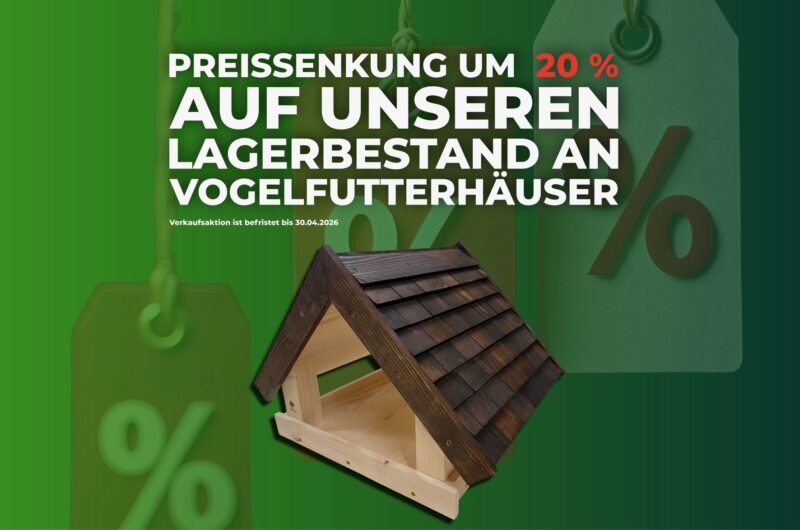 Nutze Sie unsere Rabattaktion: 20% Rabatt auf unsere Vogel-Futterhäusern. Das Ganze ist Zeitlich begrenzt – deshalb die Chance nutzen und jetzt den ersten Schritt zu einem gemütlichen Zuhause für Ihrer gefiederten Nachbarn machen.